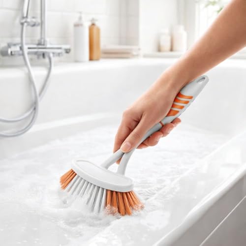 - شعيرات قوية وناعمة - مصممة بشعيرات كثيفة وناعمة تزيل الأوساخ وبقايا الصابون والبقع دون خدش الأحواض أو أحواض الاستحمام أو البلاط.