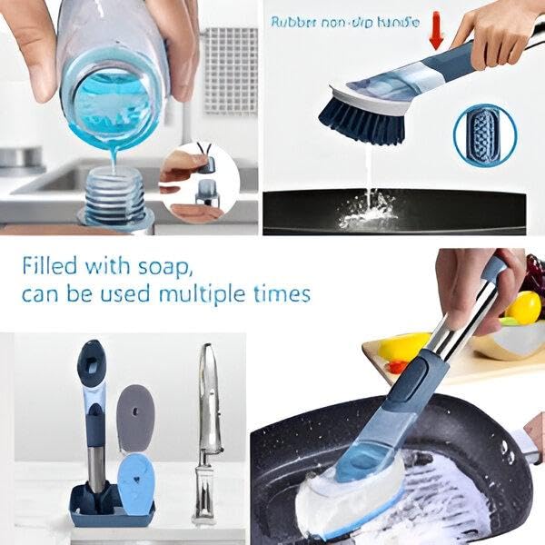 - تتميز فرشاة الأطباق هذه بنظام توزيع صابون مبتكر حيث يمكنك بسهولة صب المنظف في المقبض دون لمس السائل، مما يزيل الفوضى ويضمن عملية تنظيف صحية، بينما يمنع تصميم زر السيليكون المانع للتسرب أي تسرب للمنظفات بصرف النظر عن كيفية وضع الفرشاة.