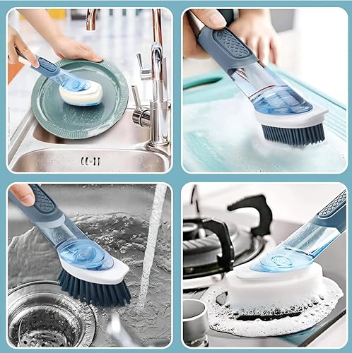 Generic - فرشاة حوض المطبخ هي أداة تنظيف مريحة مصممة لتنظيف آمن ولطيف لأواني وأدوات المطبخ، حيث تتميز بموزع صابون قابل لإعادة الملء، ورأسين قابلين للفك مع إسفنجات ناعمة