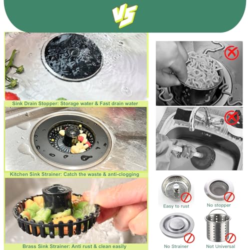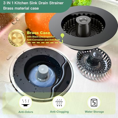 OSOVGO - مصفاة حوض مطبخ 3 في 1، سدادة حوض المطبخ، مصفاة حوض المطبخ مع سلة إضافية مضادة للانسداد لفتحة حوض قياسية أمريكية مقاس 3.5 بوصة، مصنوعة من النحاس الأسود