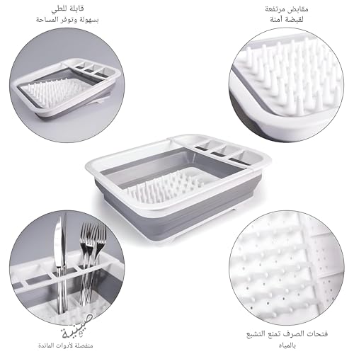 - مصفاة الأطباق القابلة للطي هذه تجمع بين إطار بلاستيكي رمادي/أبيض مع نقاط لمس سيليكون، مصممة كحل تجفيف متعدد الاستخدامات لأدوات المائدة والأطباق والأكواب والزجاجات؛ تستخدم تصميمًا من جزأين مع رف أطباق مخصص وصينية أدوات مائدة منفصلة لتحسين تدفق الهواء ووقت الجفاف والتنظيم في أي مطبخ.