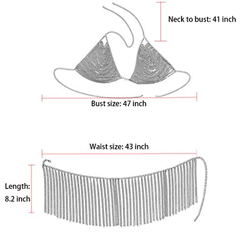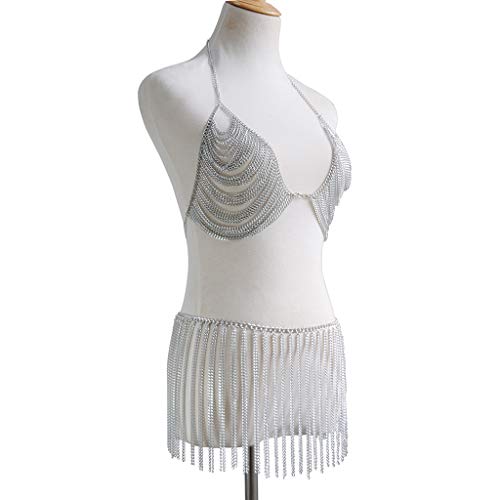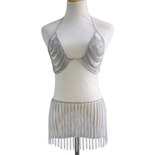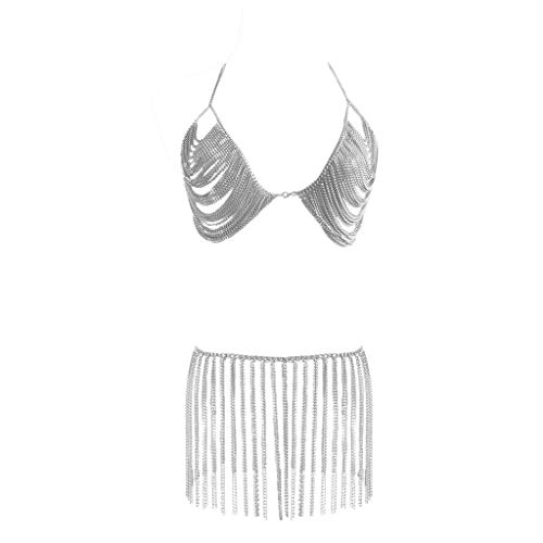 Sinkcangwu - بدلة نسائية بسلسلة بوهو مرصعة بحجر الراين، حمالة صدر للخصر وسلسلة بطن مع شراشيب وتنورة رقص هندية لحفلات الهالوين التنكرية والشاطئ والبيكيني (فضي معدني)