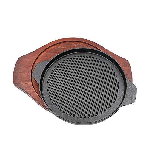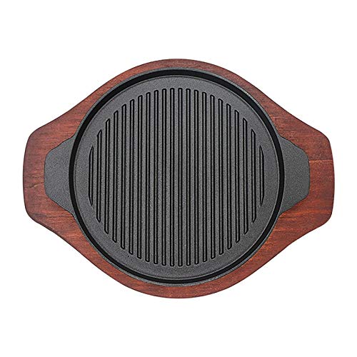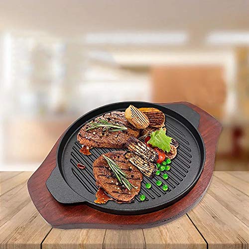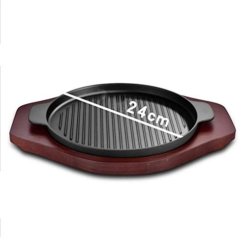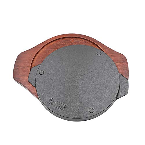 Heavy - طبق شرائح اللحم مع قاعدة خشبية من الحديد المصبوب، طبق لتقديم الطعام في المنزل او المطعم، قطر صينية الخبز: 24 سم من سيزلينج