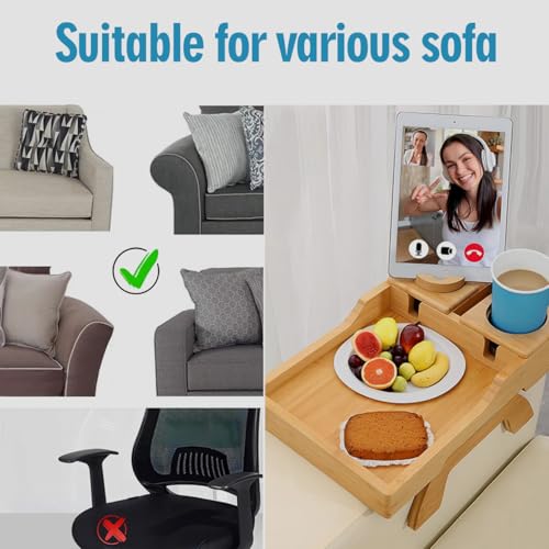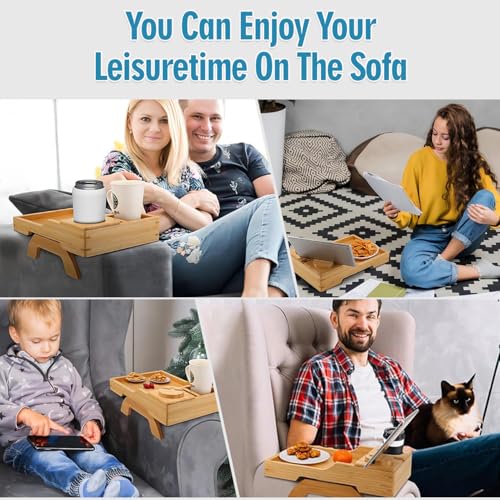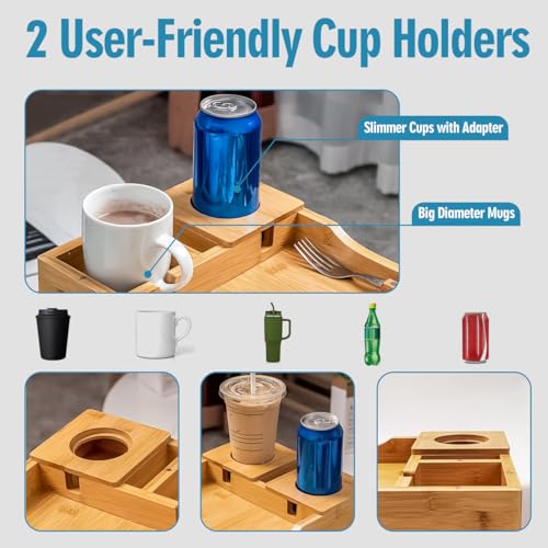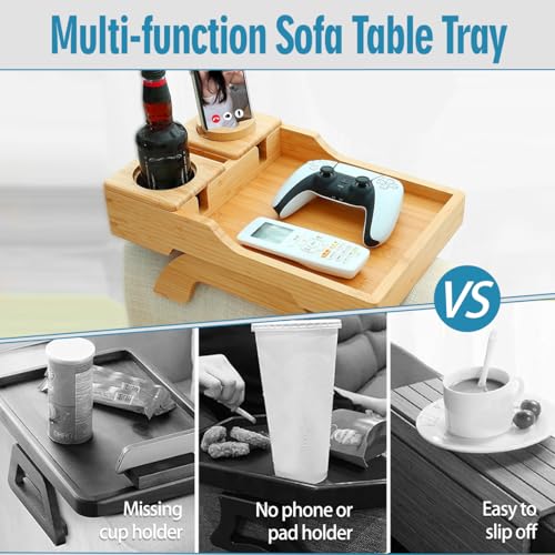 SJDUOCAI - صينية مسند ذراع الكنبة من الخيزران مع حامل دوار 360 درجة وحامل أكواب بتصميم قابلة للطي مع مساحة للقهوة والوجبات الخفيفة وجهاز التحكم من SJDUOCAI