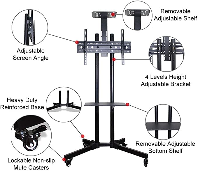 - هيكل ثابت: تم تصميم حامل التلفزيون الأرضي هذا من الستيل المتين، مما يمنع الكسر. يمكن لحامل التلفزيون الأرضي المحمول هذا تحمل وزن 50 كغم.