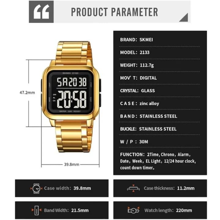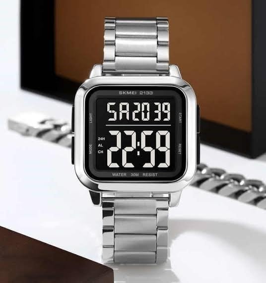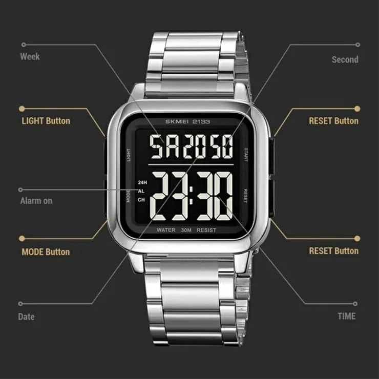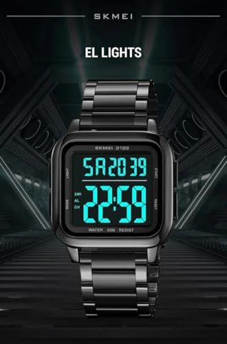 SKMEI - Skmei 2133 ساعة رقمية رجالية، فولاذ مقاوم للصدأ، شاشة LED مزدوجة، مقاومة للماء 3ATM، منبه وتاريخ