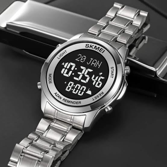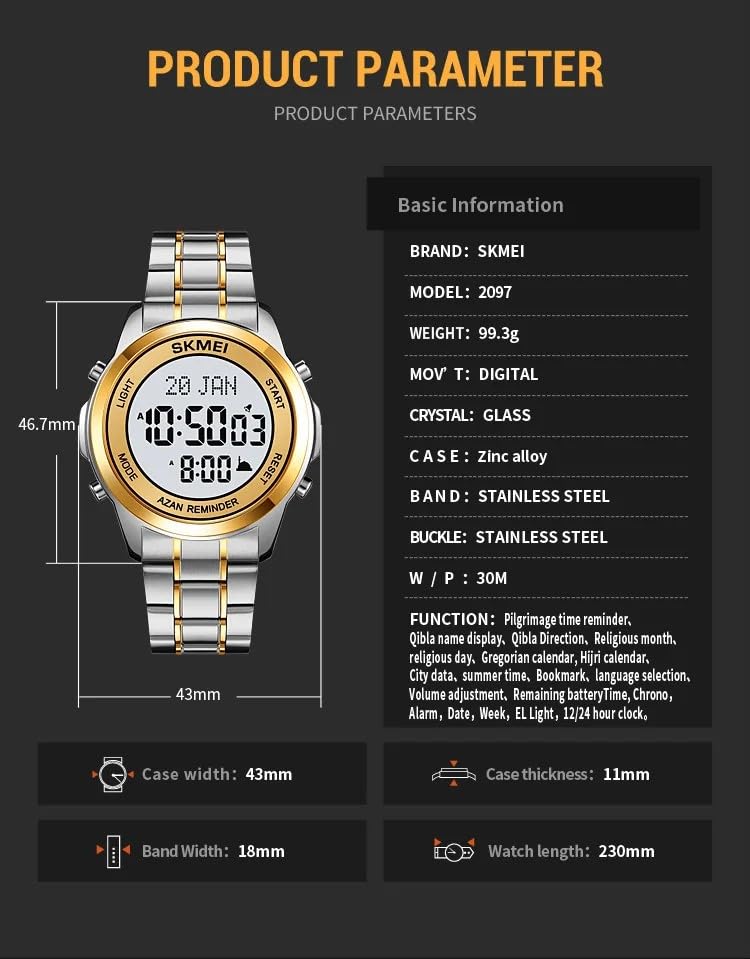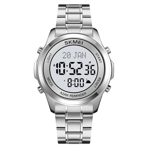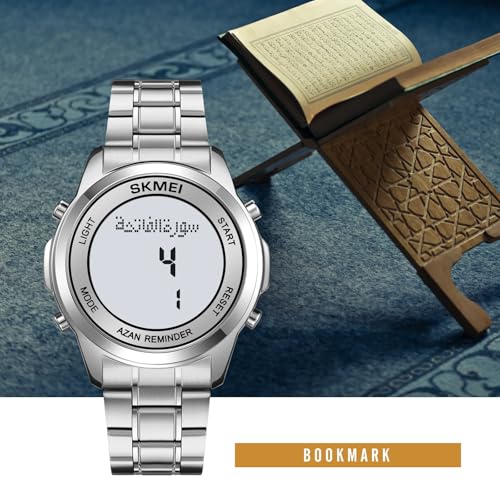 SKMEI - SKMEI ساعة رقمية إسلامية مع أوقات الصلاة، اتجاه القبلة، تقويم هجري وميلادي، تذكير الأذان، سوار ستانلس ستيل، موديل 2097
