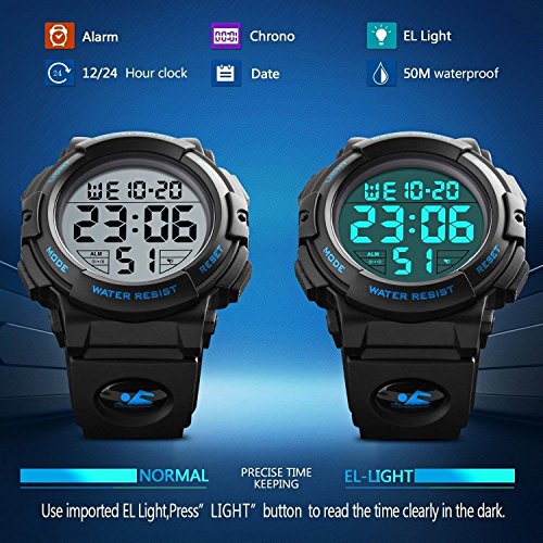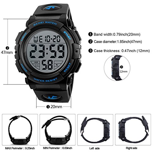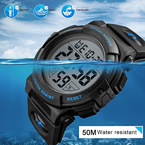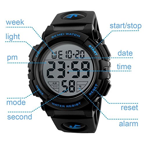 SKMEI - ساعة ديجيتال وانالوج بعقارب بحركة كوارتز ومينا مربع كبير باضاءة LED مقاومة للماء مع دعم للعديد من المناطق الزمنية وساعة ايقاف للرجال سكيمي- 1258 أسود وأزرق