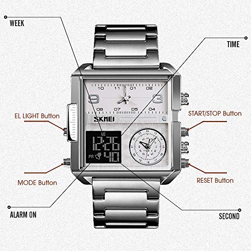 SKMEI - سكمي ساعة رياضية رقمية للرجال بشاشة LED مربعة كبيرة انالوج كوارتز مع مناطق زمنية متعددة، ساعة ايقاف مقاومة للماء، فضي فاتح، 1.75 × 1.6 × 0.55 انش، للاعمال