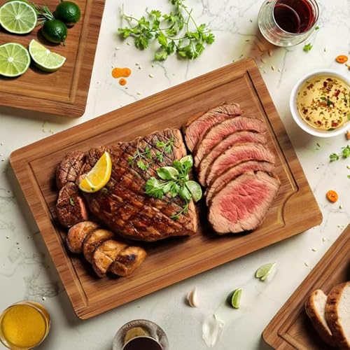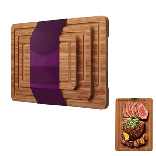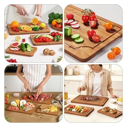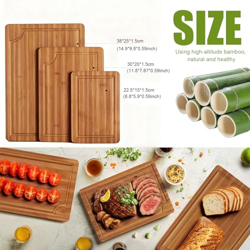 SKTMH - لوح تقطيع من الخيزران للمطبخ من اس كيه تي ام اتش 3 قطع، لوح تقطيع خشبي مع اخدود عميق للعصير ومقابض مدمجة، الواح تقطيع خشبية قابلة للعكس للحوم والخضروات والفواكه