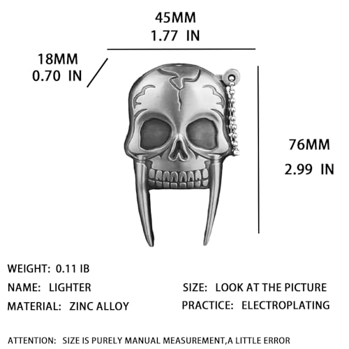 - تصميم مبتكر وفريد من نوعه: هذه الولاعة المقاومة للرياح بالحقن المباشر مصنوعة من خليط معدني من الزنك، مع تصميم جمجمة منقوش، نسيج معدني كلاسيكي، بسيطة وعصرية، وهيكل صغير متين وخفيف الوزن، مما يجعل من السهل حملها.