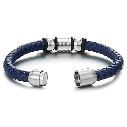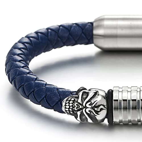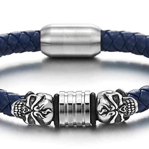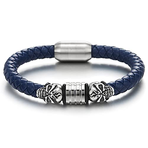 COOLSTEELANDBEYOND - سوار معصم جلد طبيعي اسود بدلاية جمجمة مع مشبك مغناطيسي من الصلب للرجال