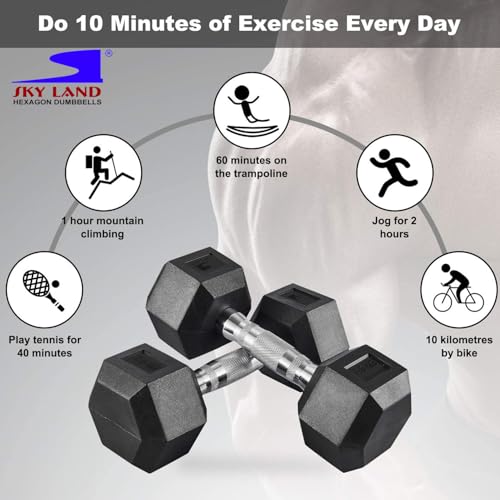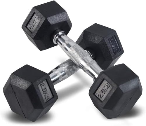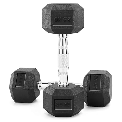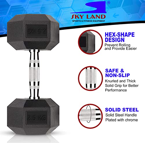 SKY LAND - مجموعة دمبل سداسية من سكاي لاند مطلية بالمطاط مع مقبض معدني من الكروم لتدريبات القوة 2.5 كجم × 2 قطعة EM92602.5، اسود