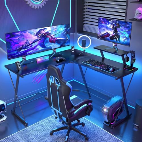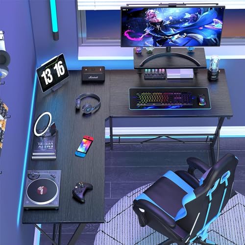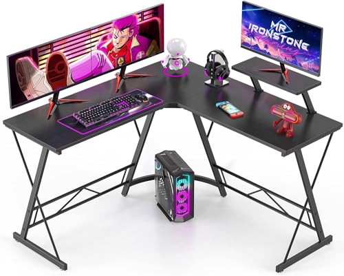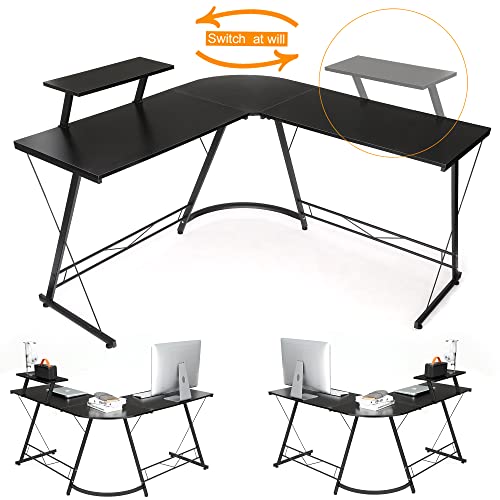 SKY-TOUCH - مكتب بتصميم L من سكاي-تاتش: مكتب ألعاب مع حامل شاشة كبير مناسب كمكتب للكمبيوتر المنزلي أو مكتب للدراسة أو الكتابة أو طاولة للأعمال الحرفية في المنزل، أسود، 1.29 متر × 46 سم × 72 سم