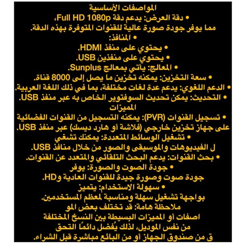 - رقم خدمة ما بعد البيع 01007729650 لمن قام بالشراء من متجرى هنا المواصفات الأساسية دقة العرض: يدعم دقة FHD 1080p، مما يوفر جودة صورة عالية المتوفرة للقنوات بهذه الدقة. المنافذ: يحتوي على منفذ HDMI. يحتوي على منفذين USB. المعالج: يأتي بمعالج صن بلس. سعة التخزين: يمكنه تخزين ما يصل إلى 8000 قناة. الدعم اللغوي: يدعم عدة لغات مختلفة، بما في ذلك اللغة العربية. التحديث: يمكن تحديث السوفتوير الخاص به عبر منفذ USB.