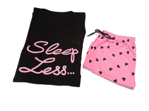 Pinky - طقم ملابس نوم قطن مطبوع مع توب اسود وشورت بينك