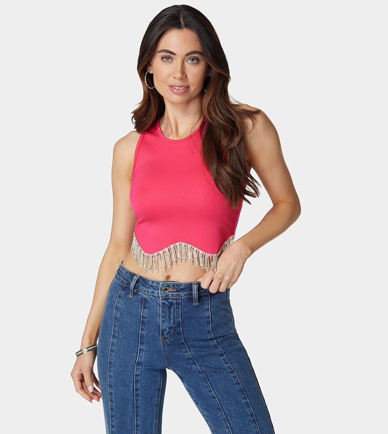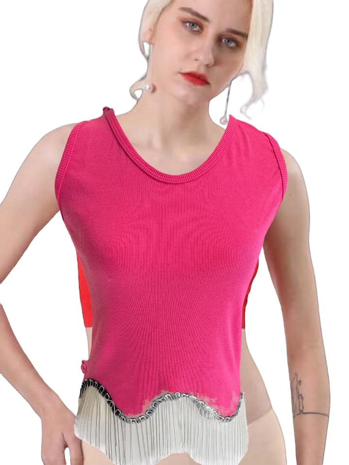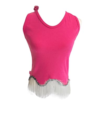 Generic - توب قصير بدون اكمام مع حافة بشراشيب، لون بينك فاقع، توب كات منسوج مضلع مع حاشية بشراشيب فضية