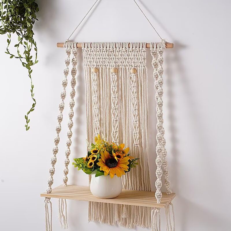 SlenyuBridal - رف مكرمية معلق على الحائط من طبقة واحدة مصنوع يدويًا بتصميم بوهيمي عائم، رف عرض للنباتات للتنظيم والديكور لغرفة المعيشة وغرفة النوم والحمام من سلينيوبريدال