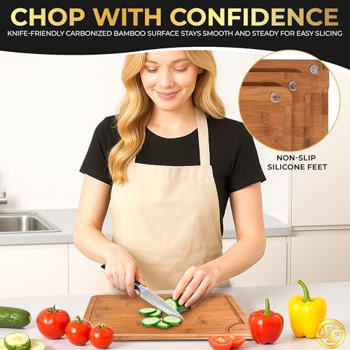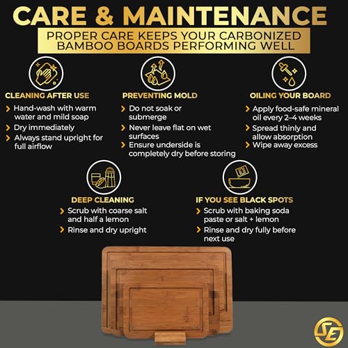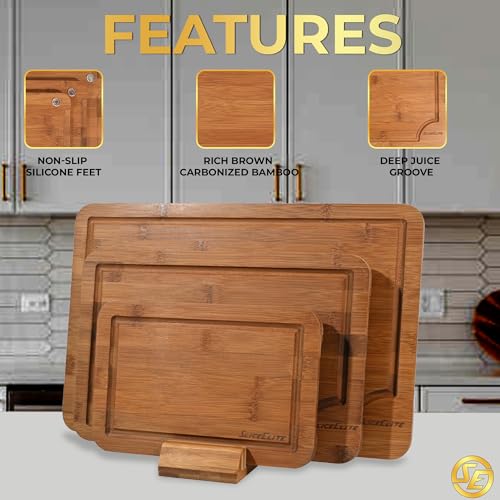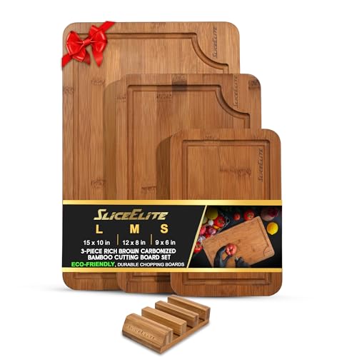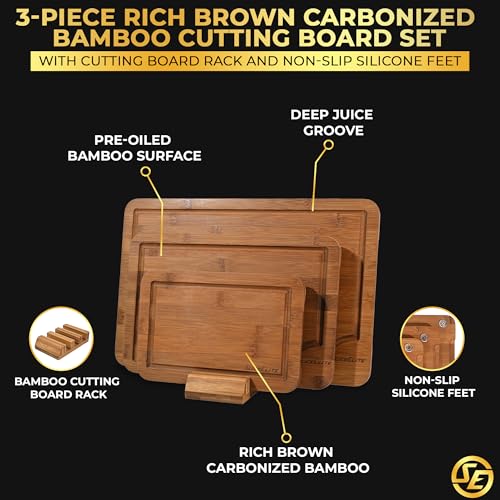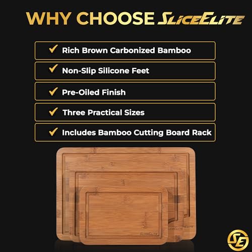 SliceElite - مجموعة الواح تقطيع من الكربون العميق من 3 قطع من سلايس اليت - الواح تقطيع غير قابلة للانزلاق مع حامل خشبي طبيعي واخاديد عصير - الواح تقطيع سوداء حديثة لاعداد المطبخ (مقاس L، M، S)
