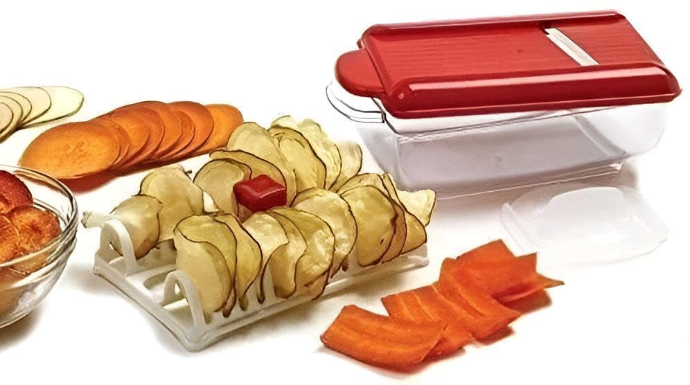 - بأبعاد مدمجة تبلغ حوالي 7.75 انش × 2.75 انش × 4.75 انش (19.5 سم × 7 سم × 12 سم)، يتميز هذا الوشاح بفعاليته في توفير المساحة، وهو مثالي للمطابخ المنزلية، واستخدامات متعددة بما يكفي لإعداد رقائق الخضروات المختلفة بسرعة وبطريقة صحية.