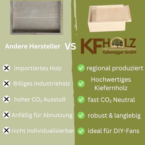 - صُنع في ألمانيا – نحن في كيه اف-هولز نضمن أعلى مستويات الجودة باسمنا، كما أن صندوق التغليف الخشب الخاص بنا مصنوع في النمسا. مضمون أنه ليس من المنتجات المصنعة بكميات كبيرة.