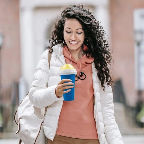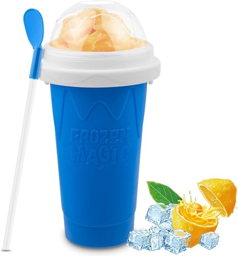 FLANXUS - كوب صانع سلاشي سريع لصنع السلاش المجمد السحري لصنع الايس كريم منزلي الصنع مع غطاء وماصة، كوب ضغط لصنع السموثي والسموذي كوب تبريد محمول (ازرق)