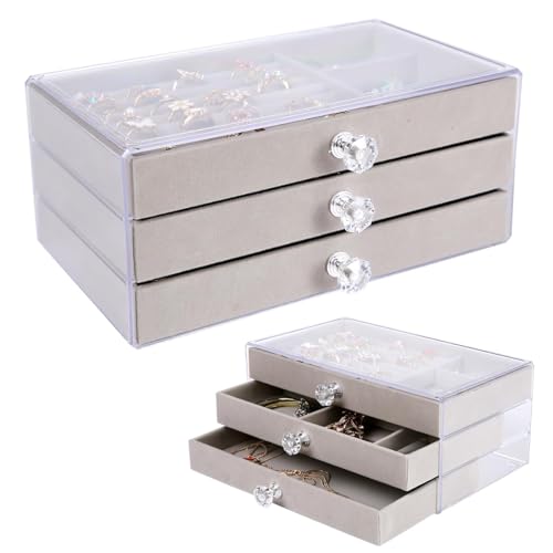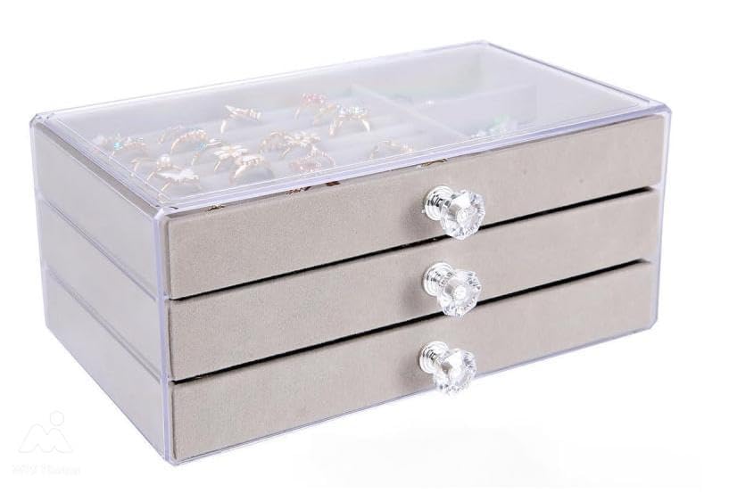 Generic - صندوق تخزين مجوهرات مكون من 3 أدراج مع مقابض كريستالية بلون رمادي قطيفة وجزء علوي من الاكريليك الشفاف من اس ام 4 يو