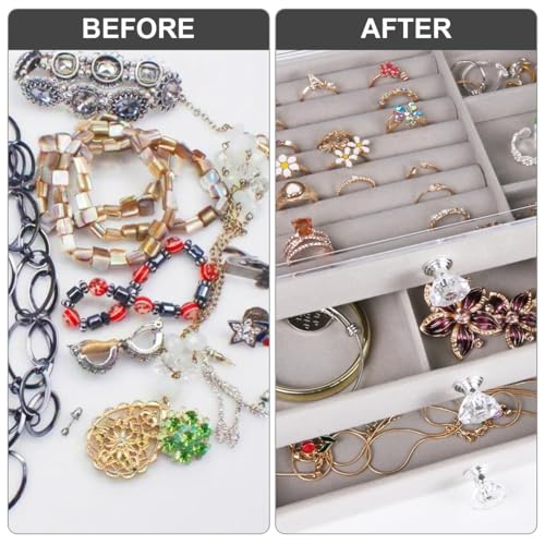 - تصميم أنيق: صندوق تخزين مجوهرات بثلاثة أدراج، يتميز ببطانة قطيفة رمادية فاخرة ومقابض على الطراز الكريستالي لتنظيم راقي.