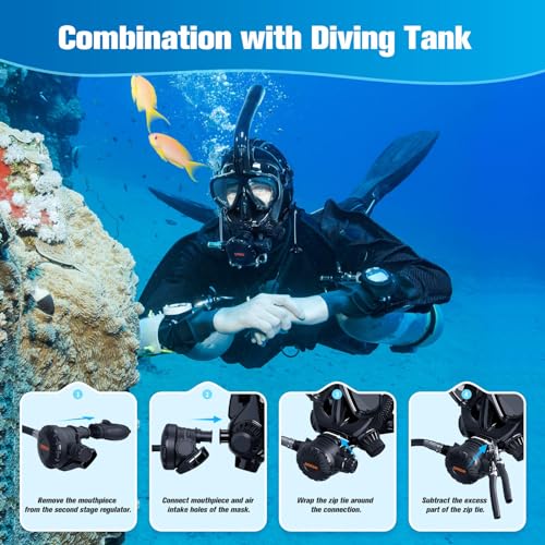 - 【أفضل ملاءمة وسهولة الارتداء】: يوفر قناع الغوص لكامل الوجه ملاءمة ممتازة، بفضل حزام الرأس القابل للتعديل المكون من 5 نقاط. يمكننا ضبط السوار بحرية وفقًا لخطوط الوجه. وفي الوقت نفسه، يمكن أن يساعدنا جرس السحب سريع الفك على خلع قناع الغوص بسرعة.