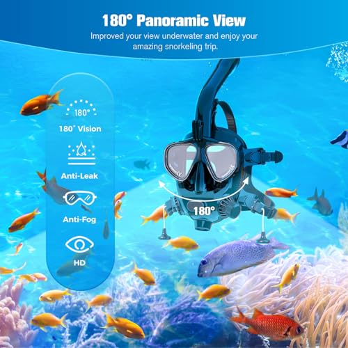 - 【تجربة غوص غامرة】: يوفر قناع الغوص لكامل الوجه الخاص بنا رؤية بانورامية بزاوية 180 درجة، مما يسمح لك بالانغماس الكامل في العالم تحت الماء. يحتوي القناع أيضًا على حامل كاميرا قابل للفصل، مثالي لالتقاط تلك اللحظات التي لا تنسى.