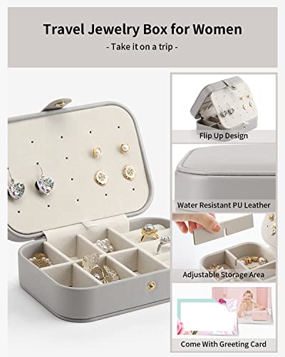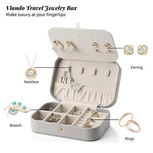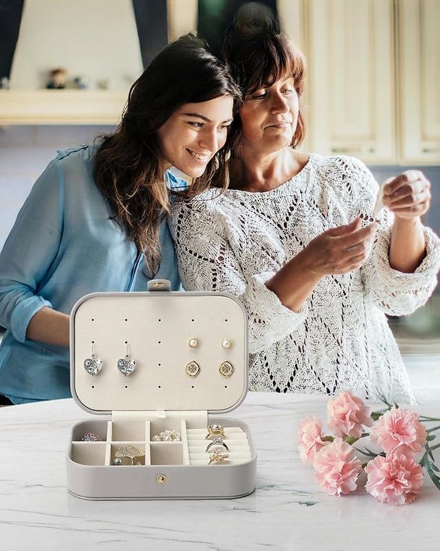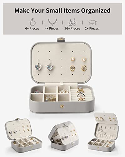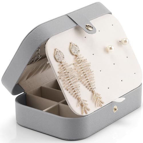 Generic - صندوق مجوهرات صغير للسفر مكون من طبقتين باللون الرمادي، حقيبة تنظيم محمولة للنساء، صندوق تخزين عتيق مع مساحات تخزين للاقراط والقلائد والخواتم