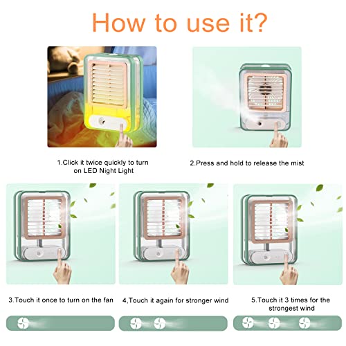 - تصميم سهل الاستخدام: يتم تشغيل مروحة التبريد الكهربائية المحمولة الخاصة بنا عن طريق مستشعر اللمس. 3 سرعات متوفرة: المسه مرة واحدة لتدفق هواء ضعيف، المسه مرتين لتدفق هواء قوي، المسه مرة أخري لتدفق هواء أقوي، وقم بإطفائها عن طريق لمسه للمرة الرابعة. المسه مرتين بسرعة لتشغيل الضوء الليد الليلي. المسه لمسه طويلة لبخاخ الرذاذ. مجهز بمصاريع قابلة للتعديل 80 درجة لتعديل اتجاه تدفق الهواء.
