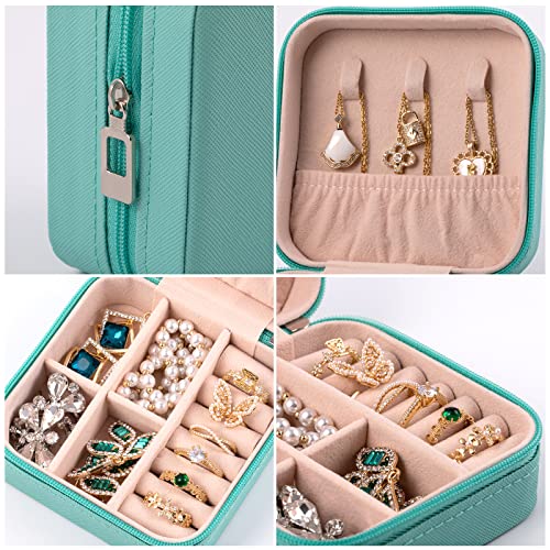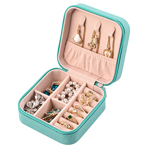 Spaceshoop - علبة تخزين مجوهرات صغيرة بتصميم محمول مزودة بسوستة لعرض المجوهرات وتنظيمها مناسبة للسفر للنساء والبنات (ازرق)، جلد صناعي