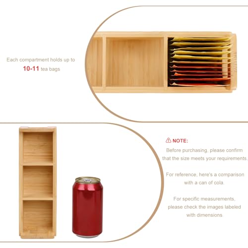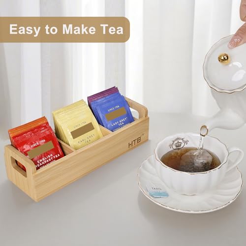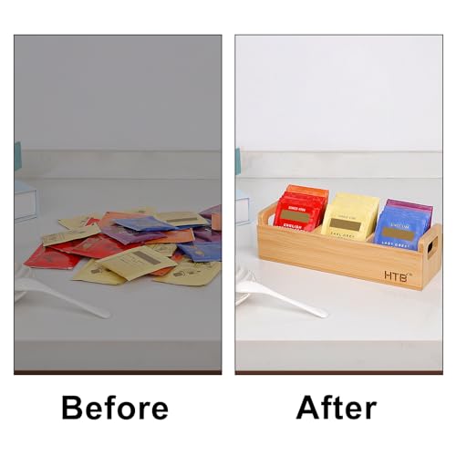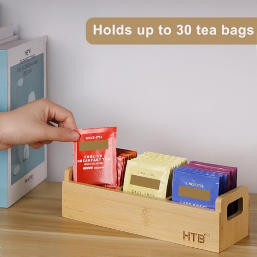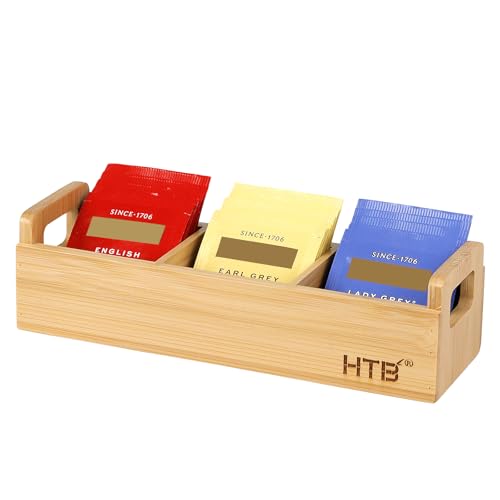 HTB - حامل أكياس شاي صغير من اتش تي بي منظم البامبو مكون 3 أقسام لموردي المشروبات والسكر والمحليات والعبوات الفردية محمول للمنزل والمطبخ أو المكتب