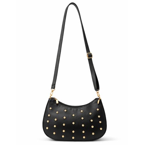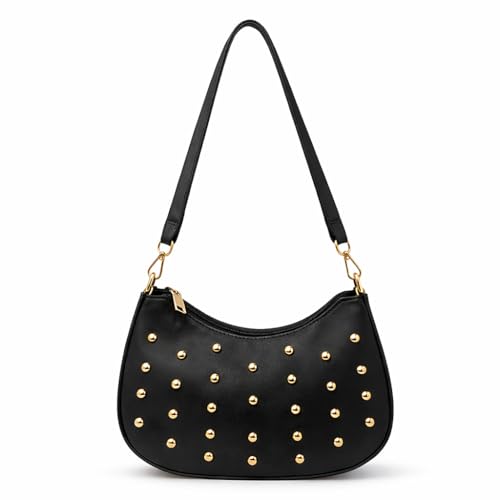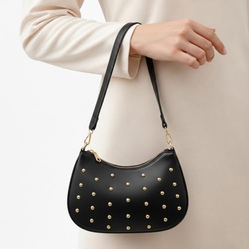Generic - شنطة كتف صغيرة للنساء مزينة بمسامير ذهبية، تتميز بسحاب علوي وحزام مريح - مناسبة للنزهات والمناسبات المسائية.