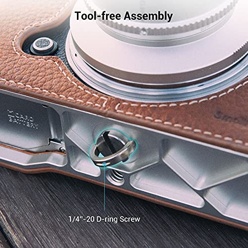 - تجميع بدون أدوات: يتم توصيل نصف الحافظة الجلدية بالجزء السفلي من الكاميرا عبر برغي حلقي على شكل حرف D مقاس 1/4 انش - 20، لا تحتاج إلى مفك براغي للتجميع والتفكيك. يتم ربط حزام الكتف المتضمن بفتحة الحزام المستديرة للكاميرا مع حلقة الحزام