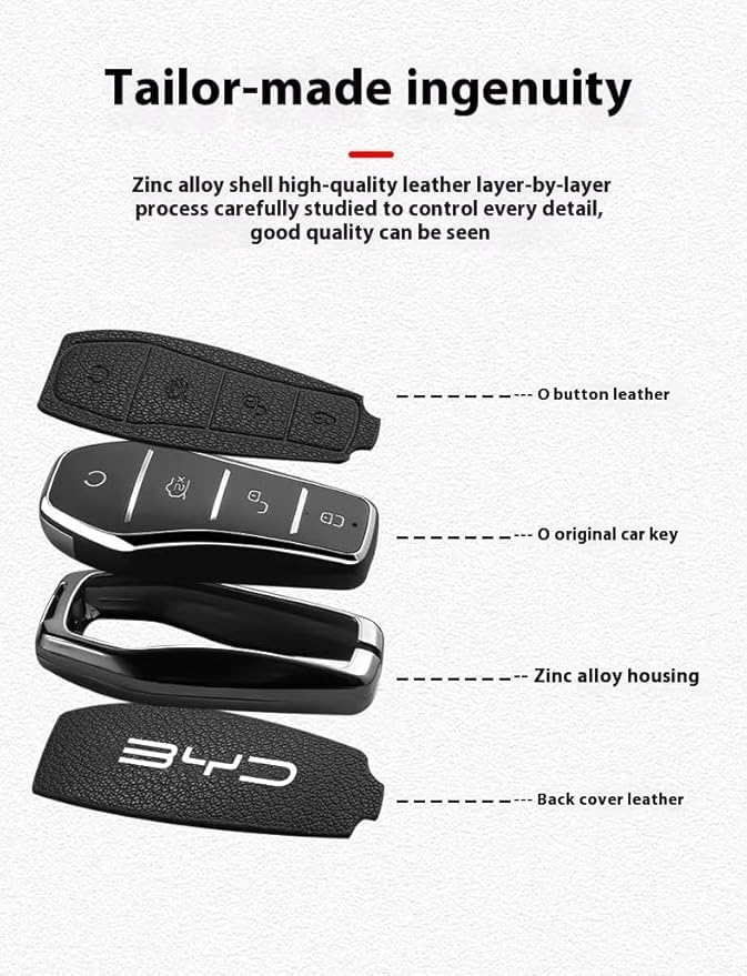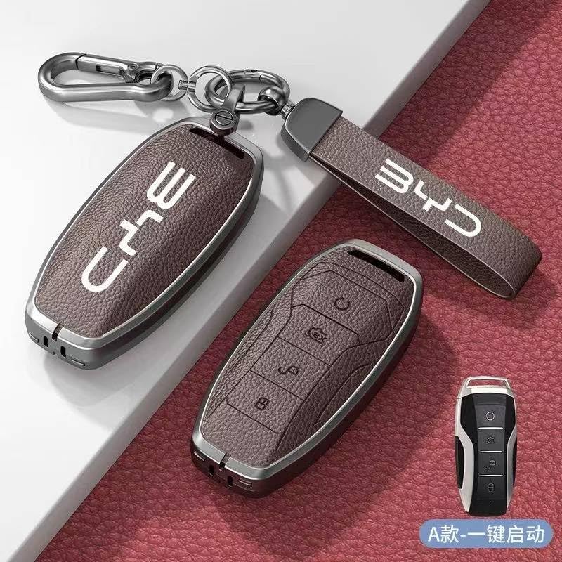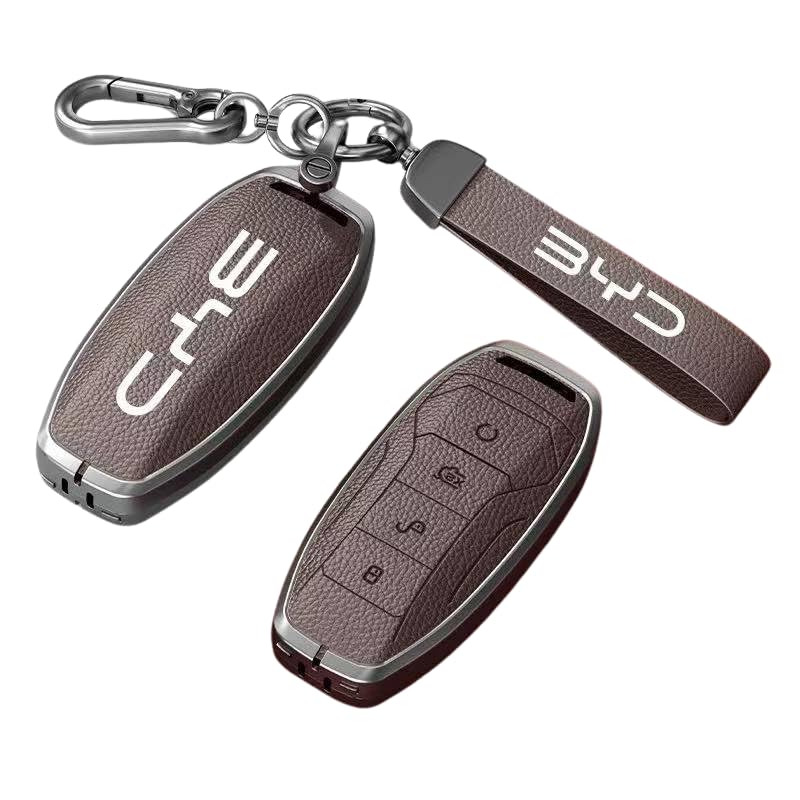 ecosystem - حافظة مفاتيح السيارة الذكية - متوافقة مع بي واي دي (اتو، دولفين، هان، تانغ، يوان، سونغ، كين) - غطاء مفتاح فوب اسود بـ 4 ازرار مع حلقة مفاتيح (بني)