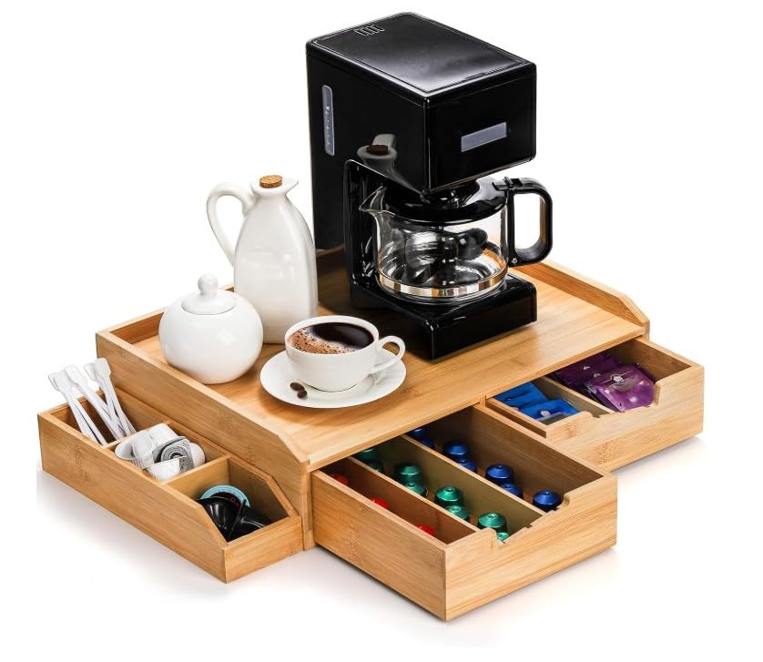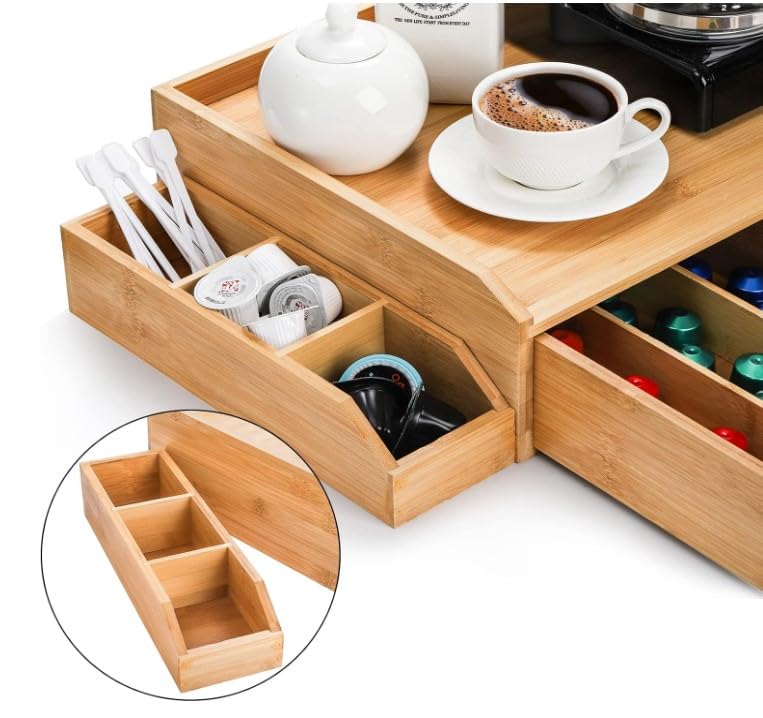Generic - منظم أدراج من الخيزران بتصميم ذكي لكبسولات القهوة، للطاولة، لأكياس الشاي مع درج وصندوق تخزين جانبي للمطبخ والمكتب والمقهى