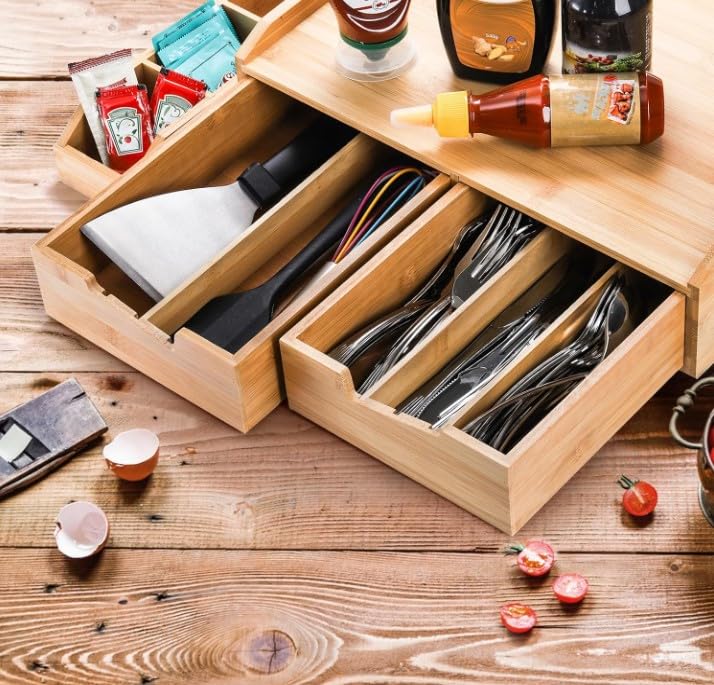 - يتضمن منظم درج من البامبو مع صندوق تخزين على الجانب. الأبعاد: 15×3×3 سم يمكن أن يحمل كبسولات القهوة أو الكبسولات الصغيرة/الكبيرة أو أكواب كيه أو أكياس الشاي أو المبيض أو السكاكين والشوكة.