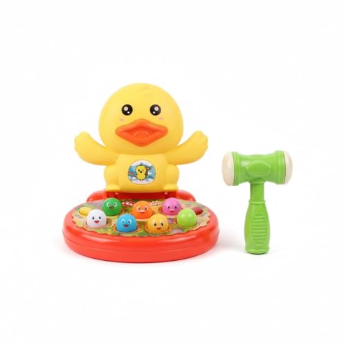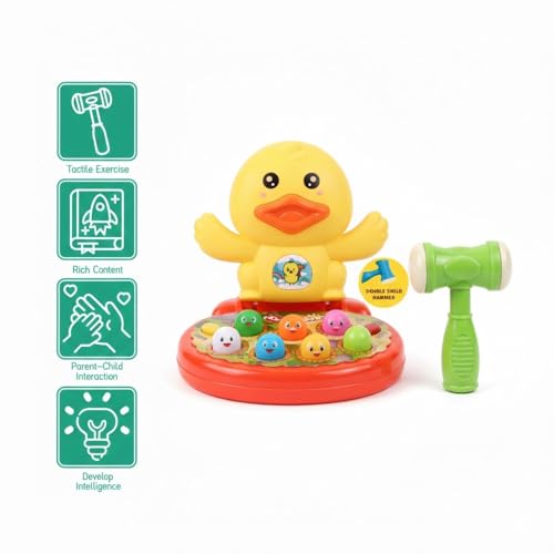 - لعبة تفاعلية بتصميم البطة: لعبة المطرقة الذكية بشكل بطة جذابة باللون الأصفر مع قاعدة حمراء تحتوي على 9 أهداف ملونة بوجوه مبتسمة لجذب انتباه الأطفال