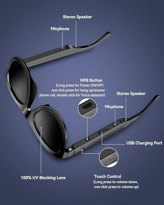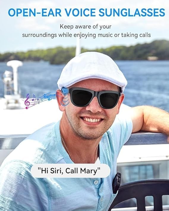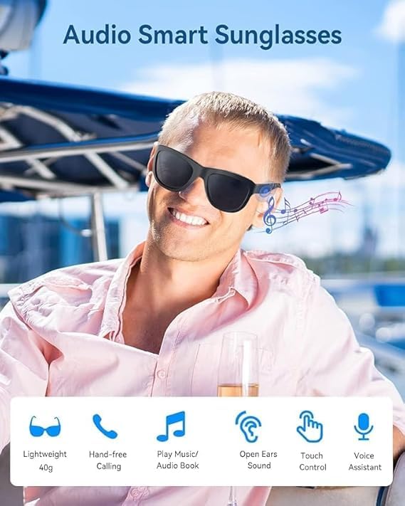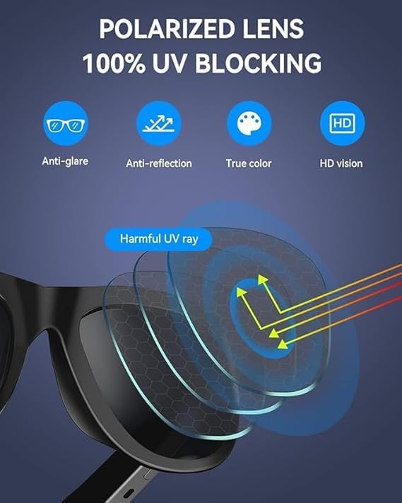 Generic - نظارة شمسية ذكية – بلوتوث لاسلكي + ميكروفون + مكبرات صوت – للاستماع للموسيقى وإجراء المكالمات أثناء القيادة – عدسات مستقطبة – لون أسود