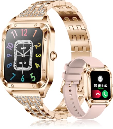 HXQHSTBG - ساعة ذكية للنساء (رد/إجراء مكالمات) HD 1.59 بوصة بجهاز تتبع اللياقة البدنية/تحكم صوتي بالذكاء الاصطناعي/أكثر من 100 وضع رياضي/مقاومة للماء IP68/مراقب معدل ضربات القلب/لأندرويد وiOS، روز جولد (2 سوار)