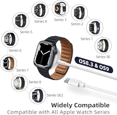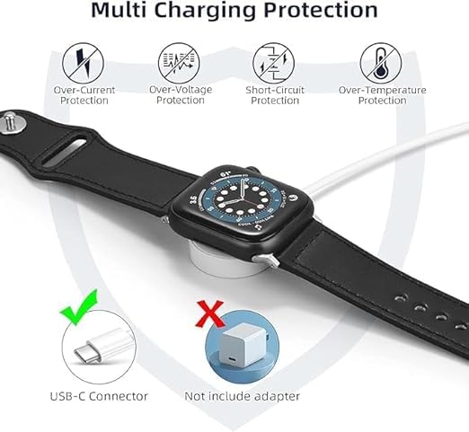 - متوافق على نطاق واسع: متوافق على نطاق واسع: شاحن الساعة الخاص بنا بمنفذ USB نوع C متوافق مع جميع سلاسل الساعات. سيتم شحن السلسلة 8/SE2 بالكامل في غضون 3 ساعات وسيتم شحن المقود بالكامل في غضون 2.5 ساعة.