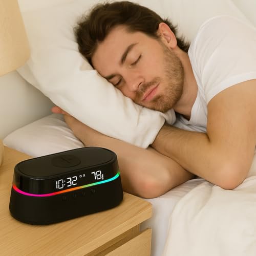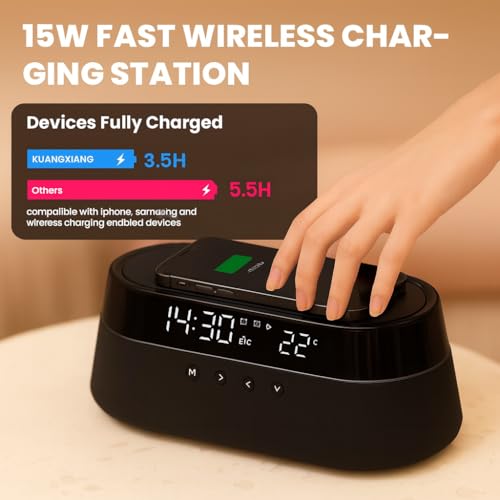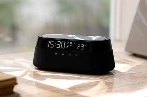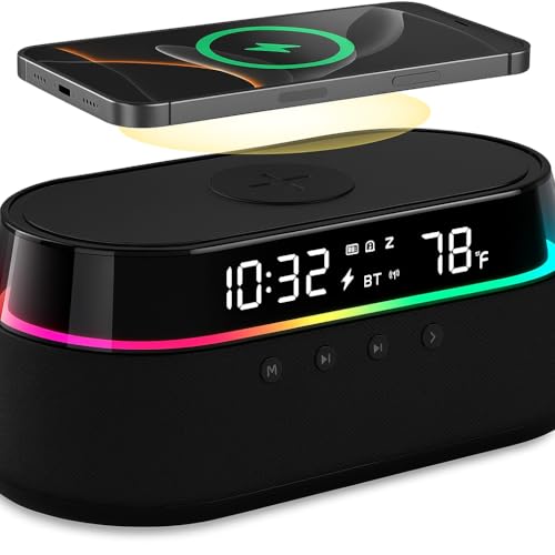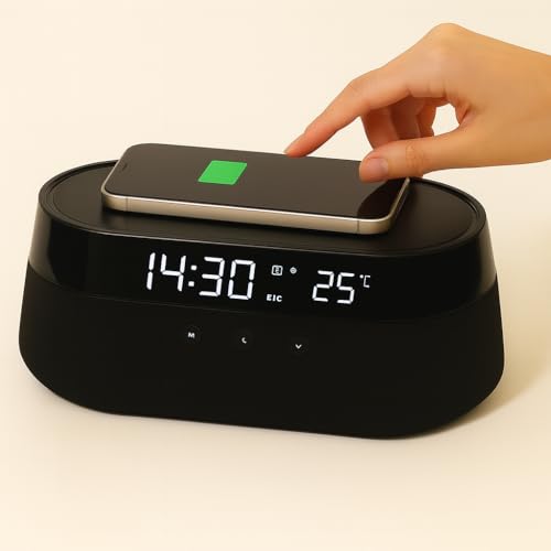 - ⚡ شاحن لاسلكي ذكي 6 في 1: يجمع بين الشحن اللاسلكي السريع، منبه رقمي، سماعة بلوتوث، مصباح جانبي، شاشة LED لعرض الساعة والتاريخ ودرجة الحرارة.