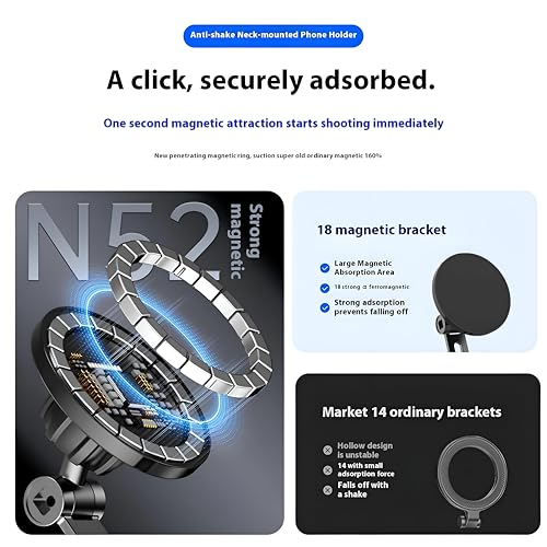 - تم تصميم حامل الرقبة بدون استخدام اليدين خصيصًا لمدوني الفيديو ومنشئي المحتوى، مما يوفر منصة ثابتة لتسجيل الفيديو عالي الجودة والبث المباشر وصور السيلفي. يضمن حامل الرقبة المغناطيسي التثبيت والفصل السريع، مما يجعل إنشاء المحتوى أكثر كفاءة دون متاعب حمل جهازك.