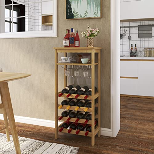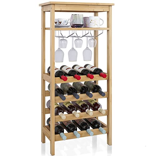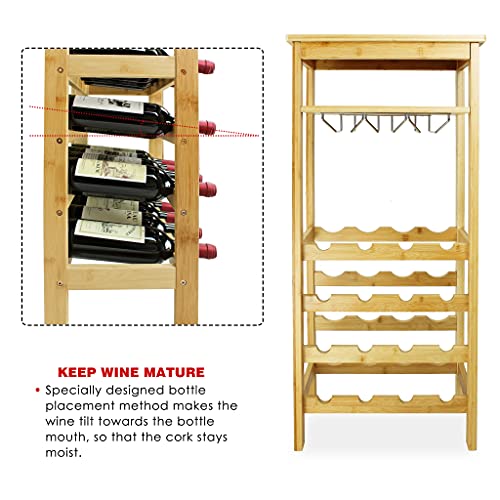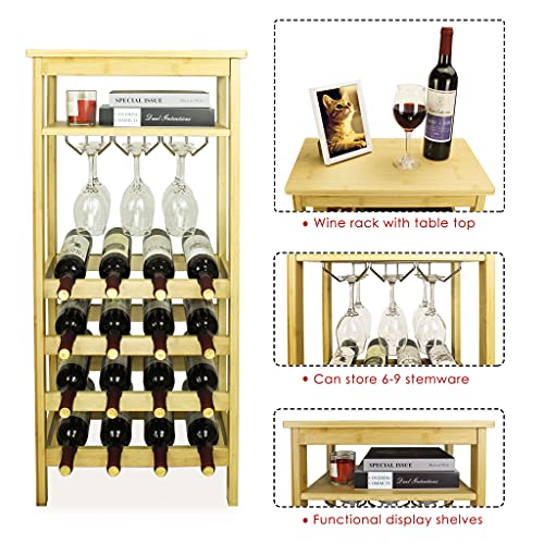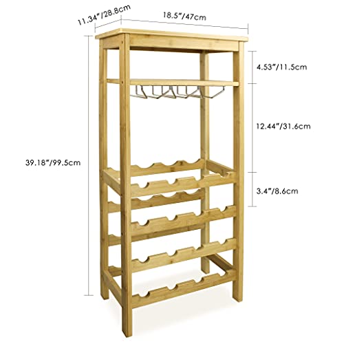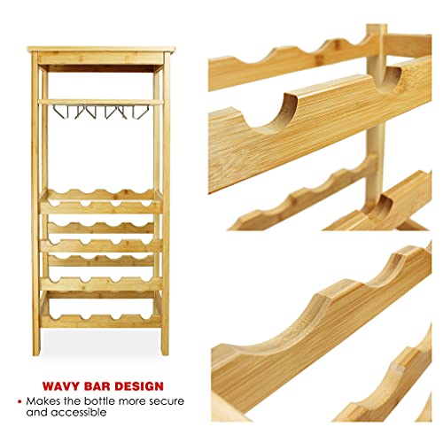 SMIBUY - حامل مشروبات مع رف زجاج وسطح طاولة من سميبي، تخزين 16 زجاجة، أرفف عرض قائمة بذاتها من الخيزران للمنزل والمطبخ والمخزن والقبو والمقهى (لون طبيعي)