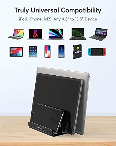Smilee - حامل لاب توب راسي مصنوع من الالومنيوم المصقول عالي التحمل مزود بـ3 فتحات للاب توب وتابلت وموبايل ومقابض تثبيت مضادة للانزلاق من السيليكون مناسب لجميع موديلات اللاب توب حتى 17.3 بوصة من سمايلي - اسود