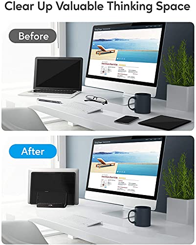 - ثبات هائل: تقترن قاعدة التوازن المتينة مع بطانات السيليكون الداخلية فائقة الثبات على حامل اللاب توب الرأسي هذا لضمان بقاء أجهزتك الإلكترونية في وضع مستقيم وآمن. حامل سطح المكتب هذا المصنوع من الألومنيوم لن ينقلب أو يسقط أو يتسبب في سقوط أجهزتك.