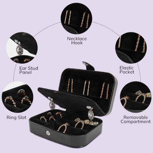 - 【صندوق متعدد الوظائف】صندوق المجوهرات هذا عبارة عن حافظة صغيرة ولكنها كبيرة السعة، يحتوي الجزء السفلي على 6 فتحات و3 مساحات تخزين قابلة للإزالة للخواتم و الحلقان والمجوهرات الصغيرة الأخرى. يحتوي الغطاء على قسم علوي به 5 خطافات وجيب سفلي بأستك للحفاظ على السلاسل والأساور في مكانها بشكل مثالي، وتوجد لوحة للحلقان في الجزء الأوسط.
