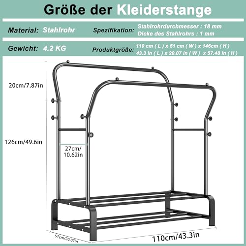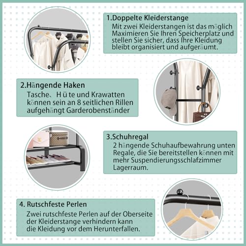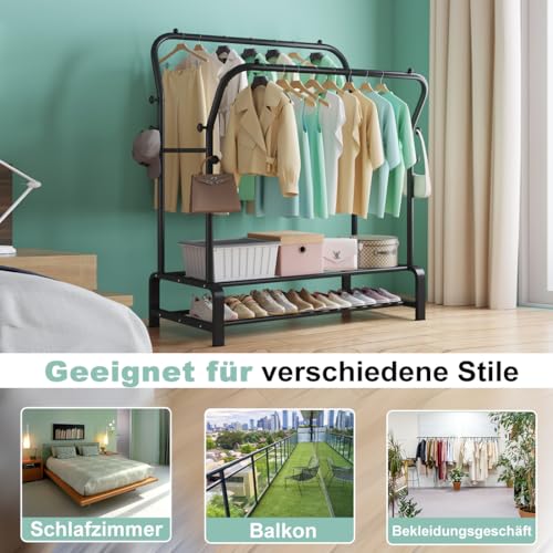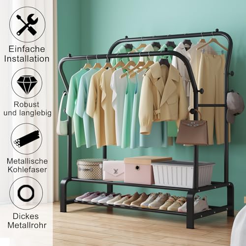 SMILOVII - رف ملابس شماعة بقضبان مزدوجة قائمة بذاتها لرف غرفة النوم حامل معاطف متعدد الوظائف قضيب قوي مع 8 خطافات ورفين للأحذية معدن أسود من سميلوفي